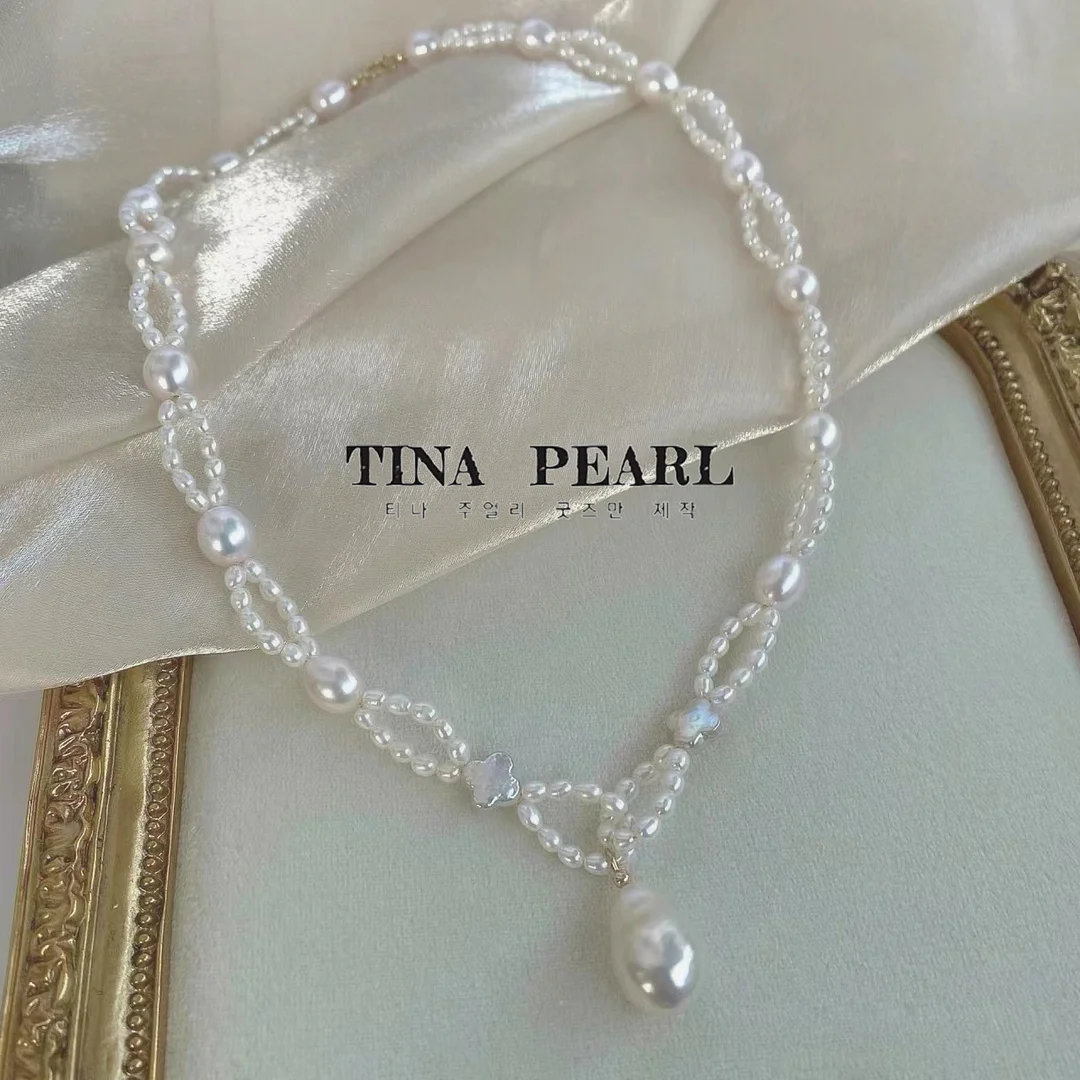an innovative combination of crossed double layers and fresh water pearls, with a necklace length of about 45cm, a retro and atmospheric style.
