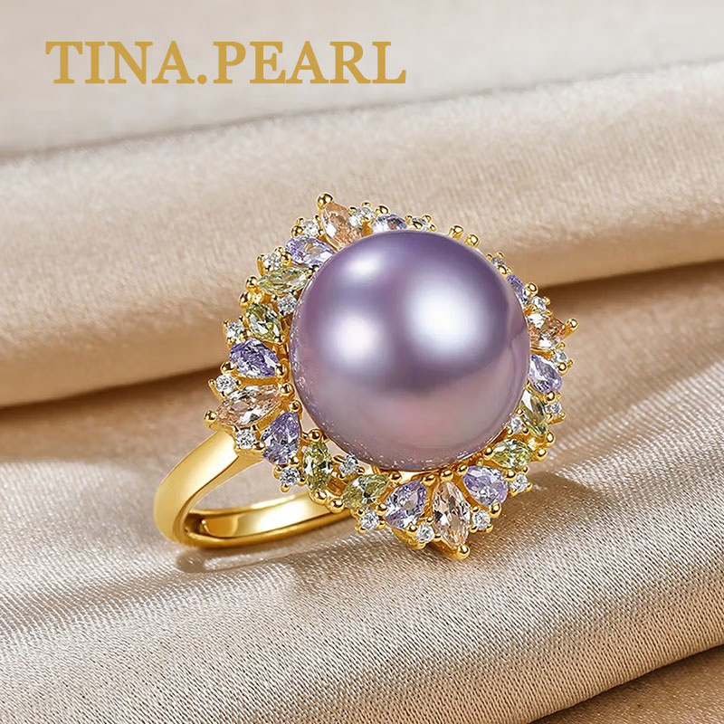 TINA Jewelry High End Luxury Open Ring Rare Purple Freshwater Pearl 13-14mm Accessories are S925 silver and synthetic cubic zirconia stones The product weighs about 105.00g Pearl shape is nearly round