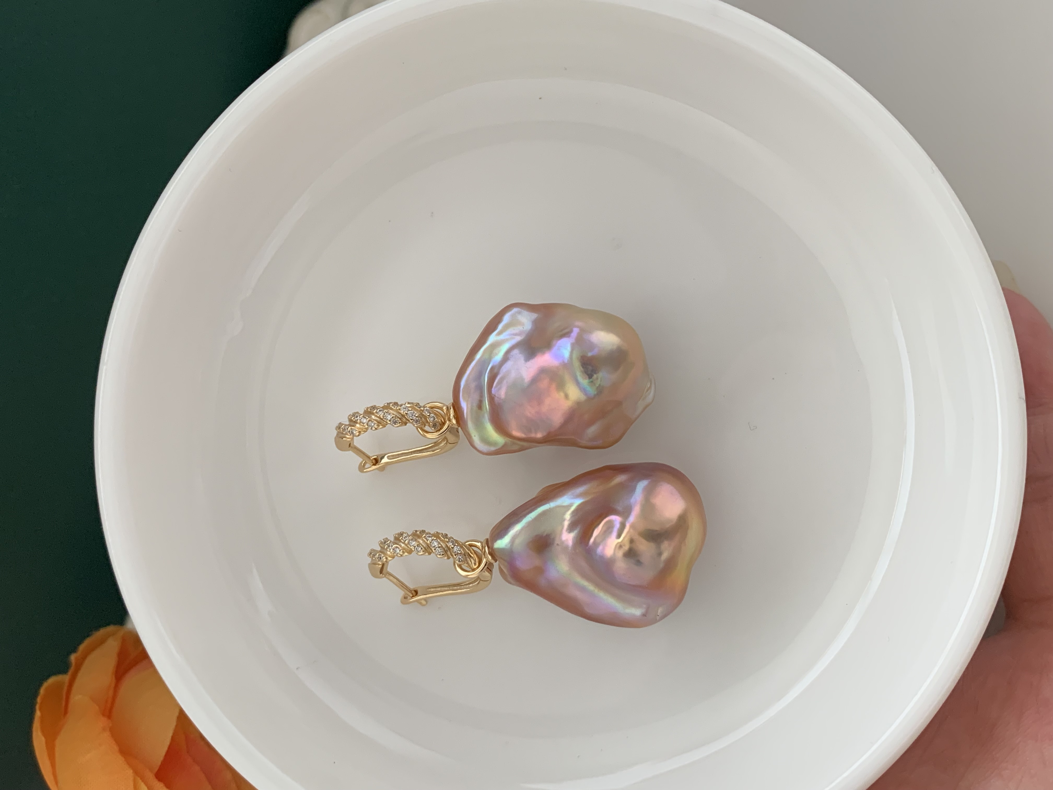 Pearl size: 19*23mm . Earring length: 38cm . Material: Natural pearls / Zircon / S925 silver (gold-plated)